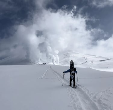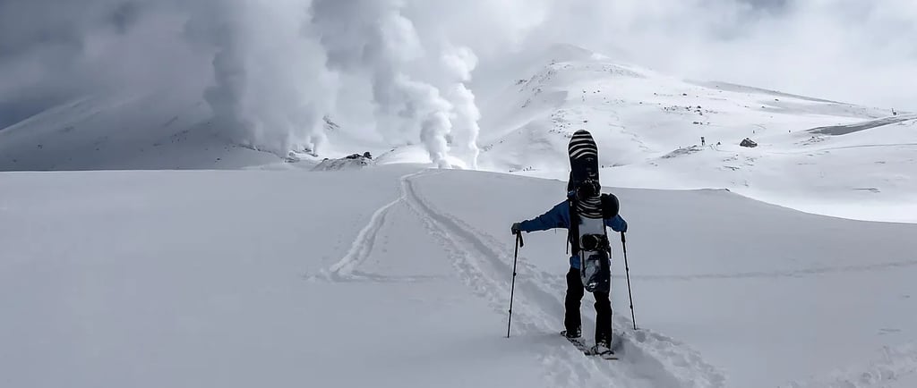 It’s hard to describe the feeling of arriving at the base of a steaming, snow-covered mountain, putting on your snowshoes, strapping the board to your backpack, and starting to climb the ridge as the steaming craters get closer and closer.